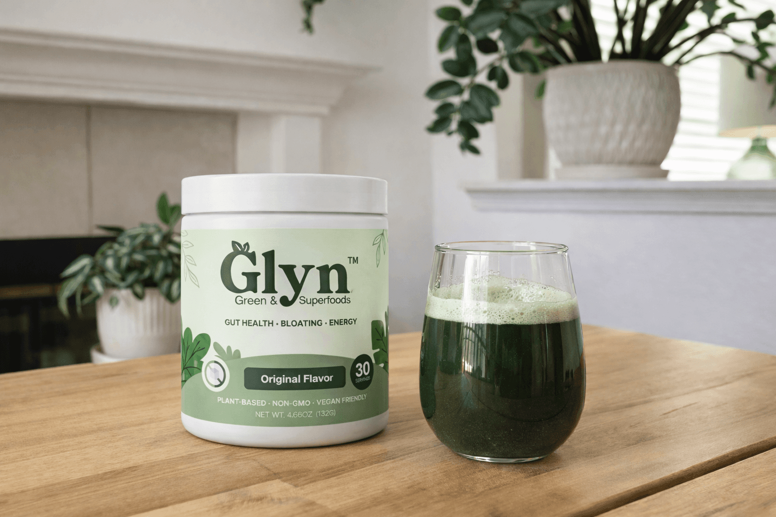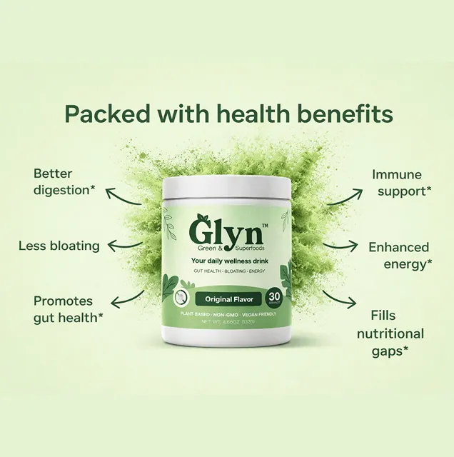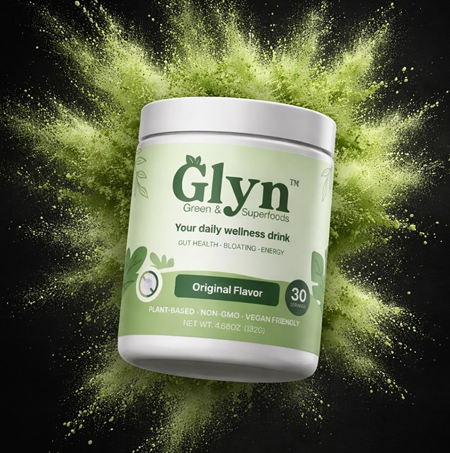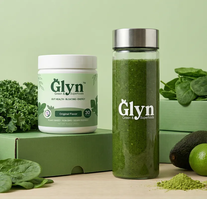 GLYN™ is a daily wellness drink made with 20+ superfoods, adaptogens, fiber, and probiotics. It supports gut health, clean energy, and daily well-being.